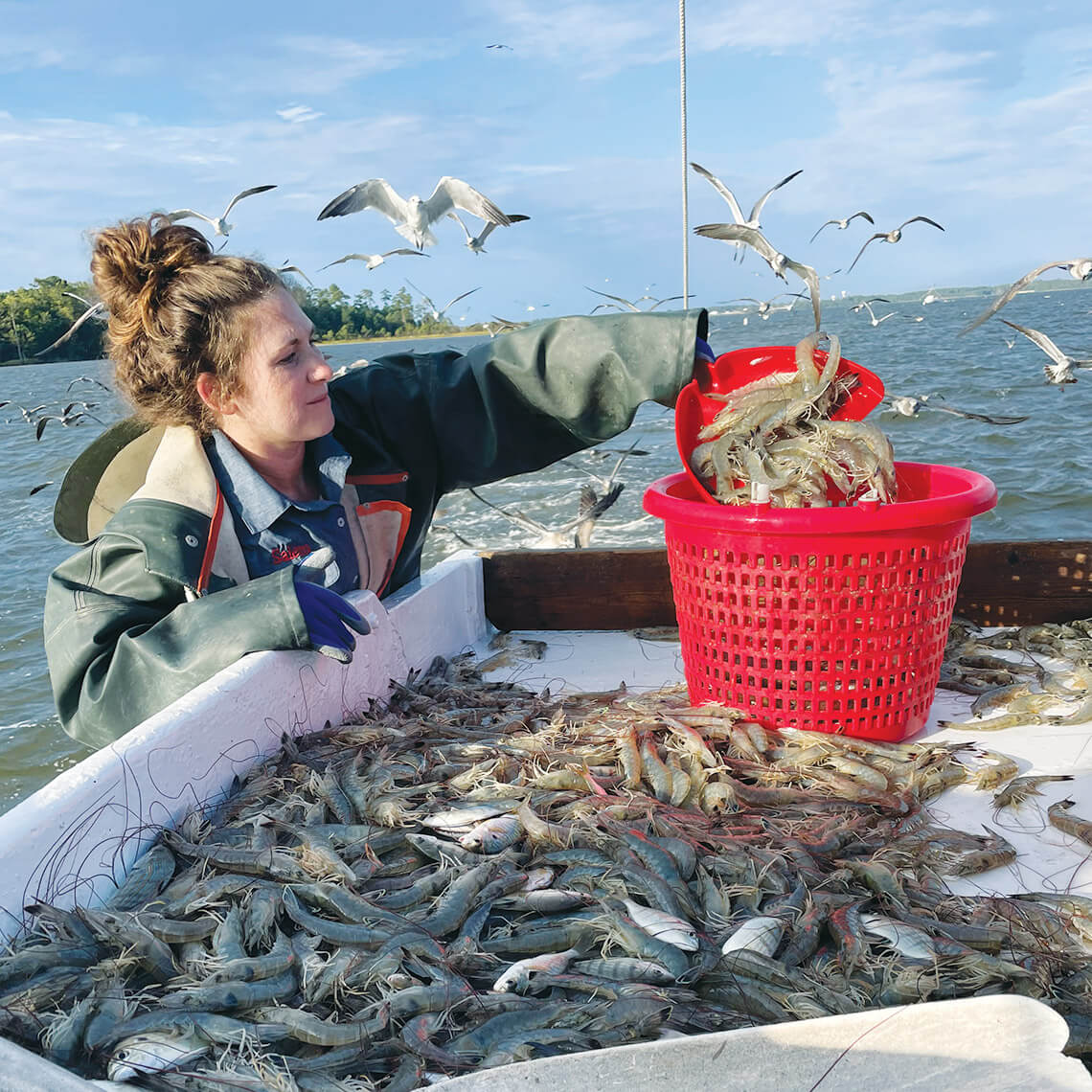Thousands of grayish white shrimp flip and hop on the table, mixed in with the inevitable “bycatch,” unintended victims of the shrimp nets — a brilliant white-and-yellow pompano, a shimmering lavender lookdown fish, and blue crabs with red-tipped pinchers. The flurry of activity on the table demands action, and it’s all hands on deck. Banana Lady uses the dustpan to scoop shrimp with one hand and, taking a cue from Wells and Jarman, uses the other hand to pick up the bycatch and toss it back into the river. The gulls are shrieking, feasting. The passenger with tongs gingerly clamps the crab shells and deposits them into their own basket. Crabs aren’t worth selling in North Carolina this time of year, but they’ll make good eating.
