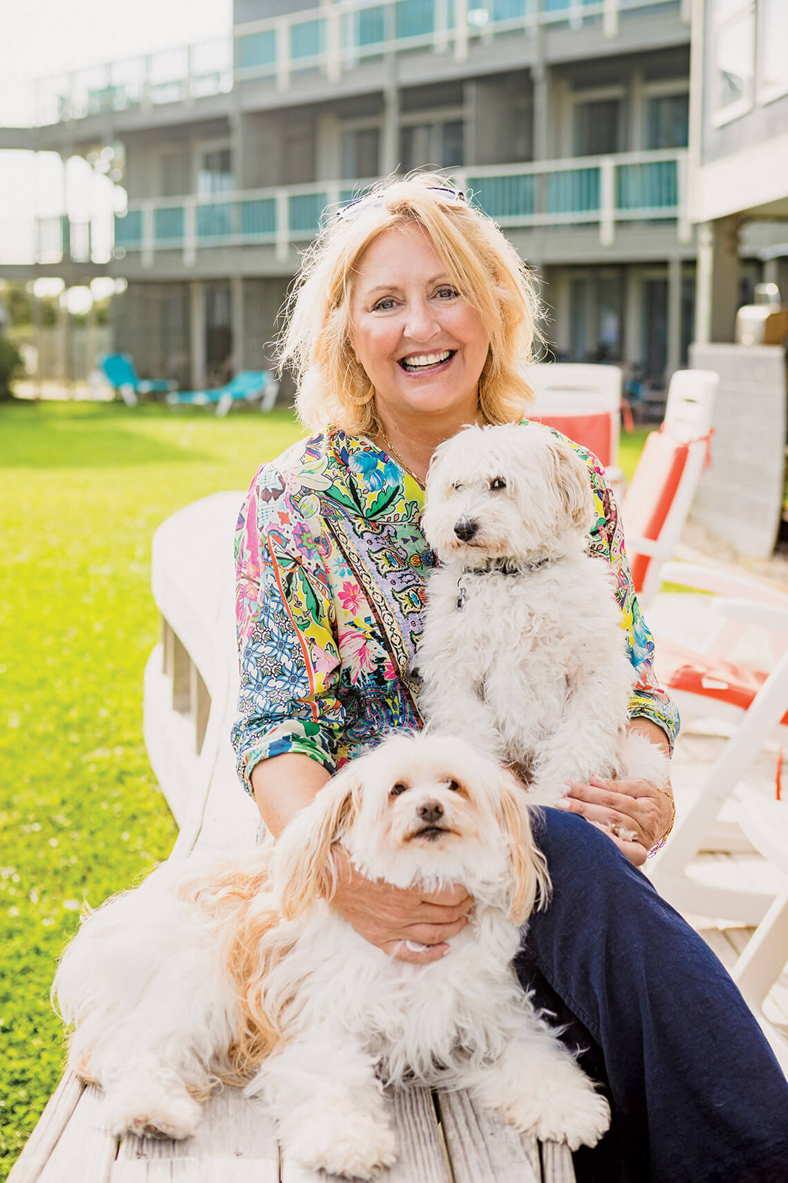 Donna Hall poses with Bodie and Bingo. Bodie passed away on March 4, but Bingo will still be greeting guests at Atlantis Lodge this summer. photograph by Baxter Miller & Ryan Stancil