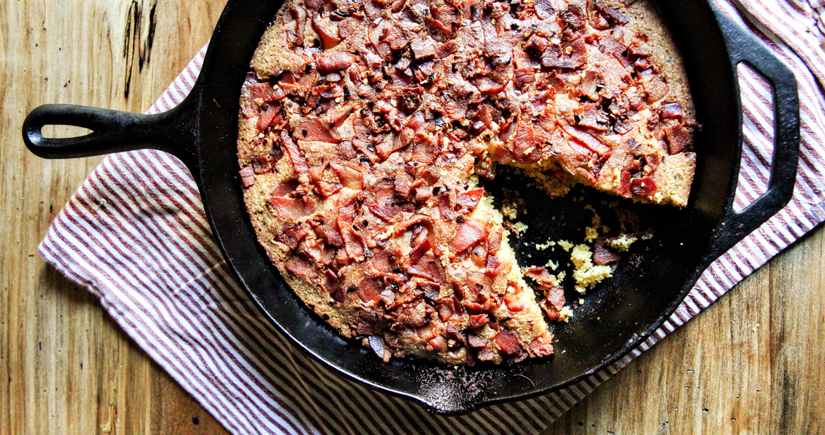 While the bacon is cooking, mix together cornmeal, flour, baking powder, baking soda, and salt. In a separate bowl, combine eggs, butter, and buttermilk. Carefully fold wet ingredients into dry ingredients.