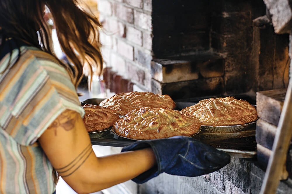 A baker must know her oven, no matter the baker, no matter the oven. This piece of wisdom comes from Tara Jensen, pie guru and owner of Smoke Signals bakery in Marshall. Bakers and wannabes pilgrimage to the tiny mountain town to learn at the hearth of Tara’s oven — an outdoor, wood-fired brick oven built in 1998 by Alan Scott, a legendary mason from California. His skills and reputation remain mythic in the world of bakers. Tara’s behemoth sits under a tin-roofed shed flanked by firewood, only a porch-depth from her baking workshop, which itself is only a dozen steps from her house. Here, life and pie are one.