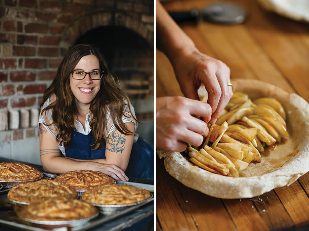 Tara often teaches classic apple pie, which, she reports, ties with sweet potato as her personal favorite. She recalls the apple hand pies that her family bought at roadside service stations when she was a little girl. She also sees apple pie as a way to bring a sense of place to her baking. Her pies feature local fruit from the surrounding mountains. Creasman Farms in nearby Hendersonville, for example, supplies her with Honeycrisps, Jonagolds, and Gingergolds. Most years, they give her a new apple to get to know: Macouns this time. A few neighbors also have learned that dropping off a basket of yard apples on Tara’s doorstep results in a pie of gratitude appearing on theirs.