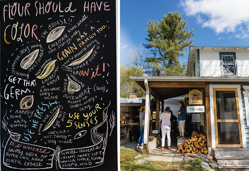 Smoke Signals’ chalkboard shares baking wisdom, and students at Tara’s workshop gather near the oven. photograph by Tim Robison