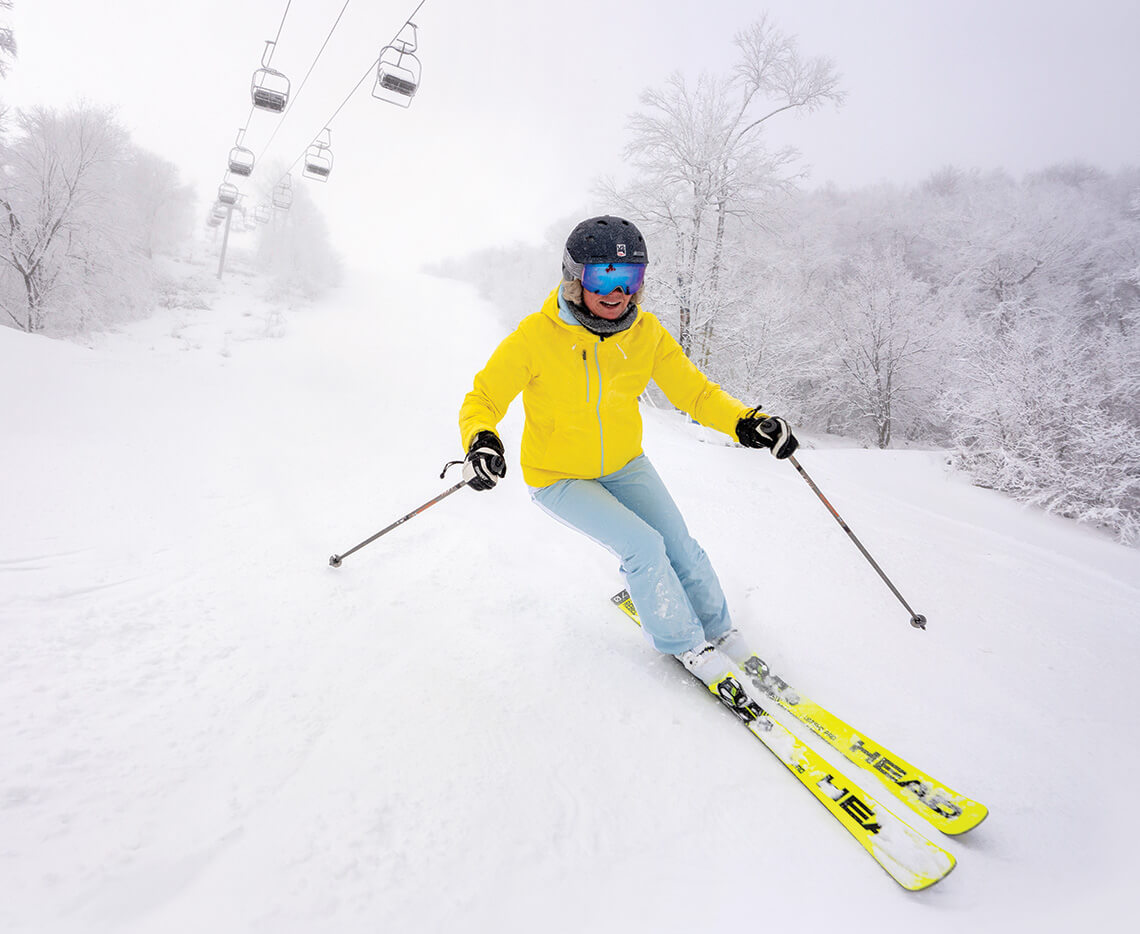 A former member of the U.S. Alpine Ski Team, Kimberley Jochl carves some fun turns down Sugar Mountain’s double-black-diamond slope, Whoopdedoo, under the Gunther’s Way chairlift. photograph by Derek Diluzio