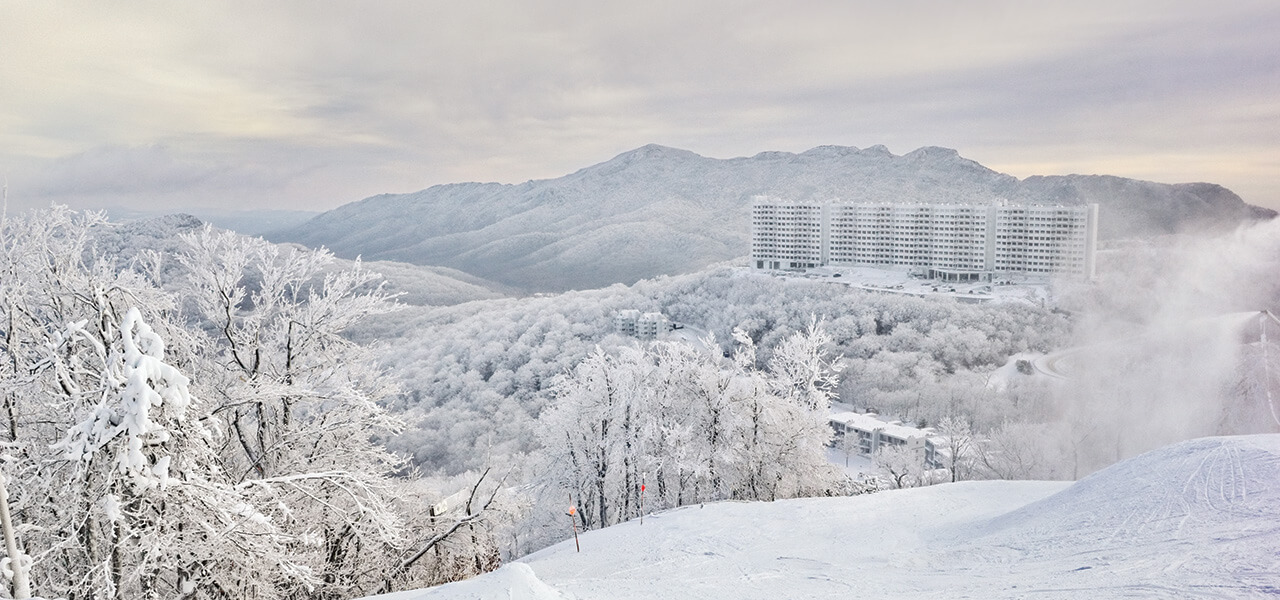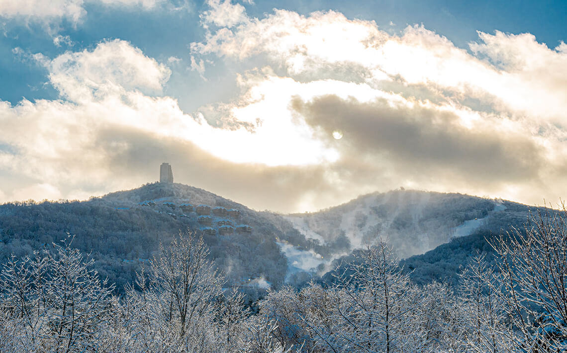 On late afternoons in wintertime, when the sun peeks out from behind the clouds, the white ski slopes of Sugar Mountain provide dramatic views for travelers driving along NC Highway 184.<br><span class="photographer">photograph by Derek Diluzio</span>