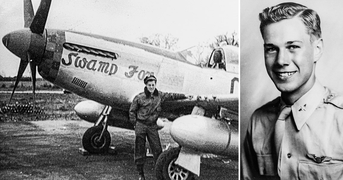 First Lt. Will Foard (pictured, right, in 1944) flew the original Swamp Fox toward the end of World War II. As a 20-year-old pilot stationed in England in 1945 (left), Foard named his P-51 with a sly nod to the famously elusive Revolutionary War general. Photography courtesy of JULIE TOFFALETTI, MIFLIPPO/ISTOCK/GETTY IMAGES PLUS