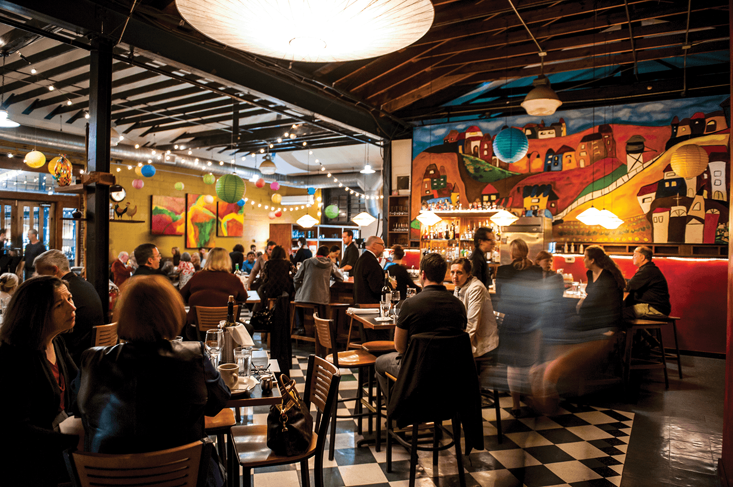I glance over the three-course menu. For an appetizer, there’s a choice of chicken liver pâté on toast, a bibb salad, or cauliflower soup. The main courses are ricotta gnocchi, shrimp and grits, or Painted Hills tri-tip. And for dessert: rum raisin bread pudding or chocolate and almond cake.