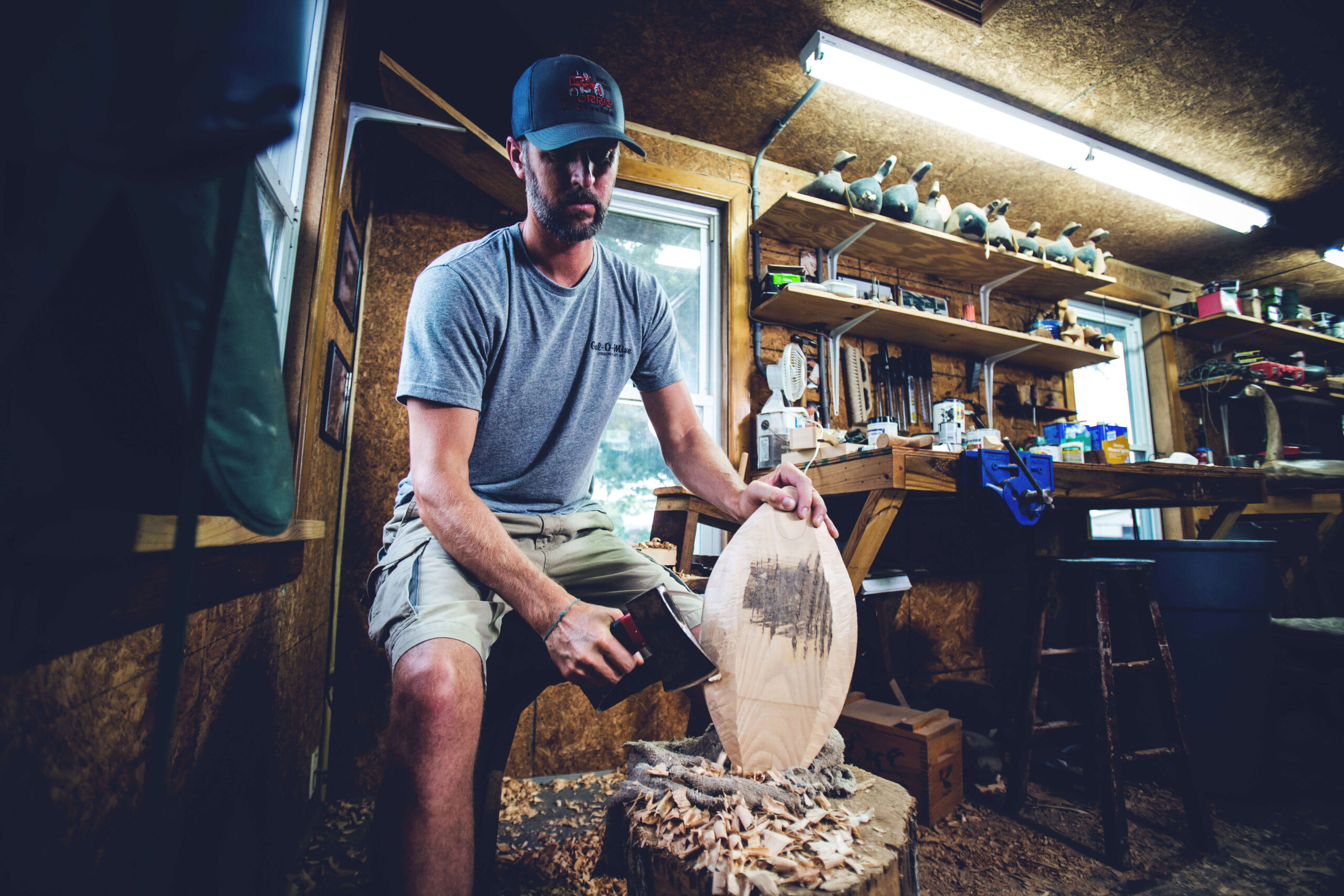 “Currituck decoys aren’t fancy or extravagant — they didn’t have to be,” Sawyer says. He finishes each decoy with simple, block-style painting. Most don’t even have eyes. “They’re just big and they show up in the water,” he says.