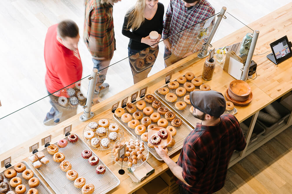 You’ll find an assortment of treats — Cinnamon Shug, Glazed, Salted Caramel, Vanilla, and Old Fashioned — fill Vortex’s glass display shelves. photograph by Andrew Kornylak