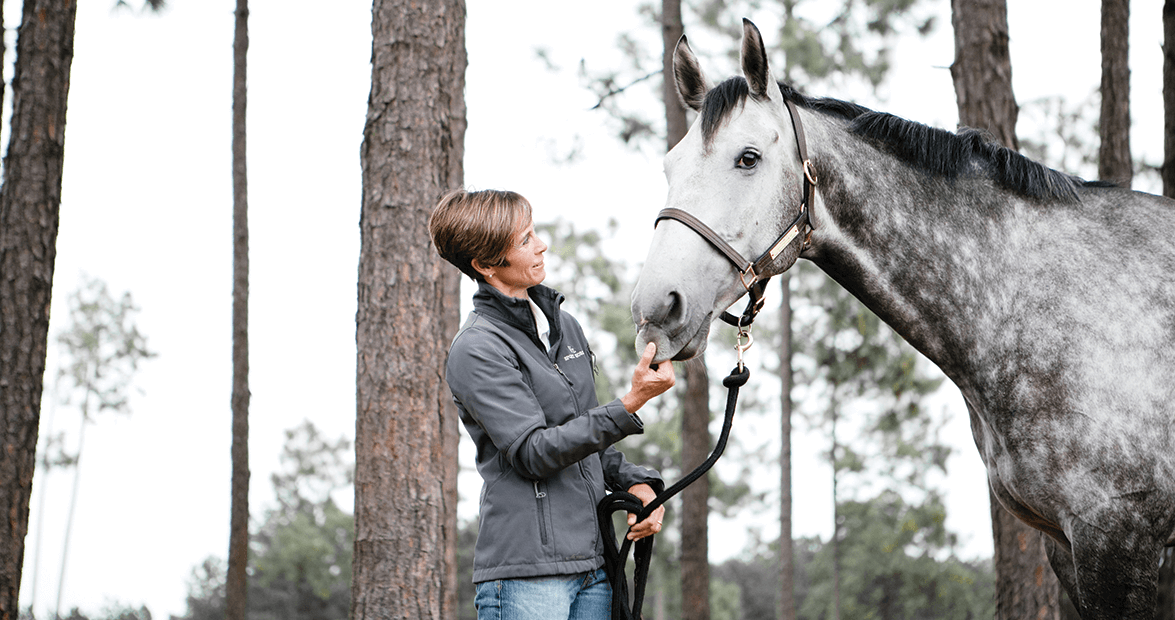 And then she appears in the dimness: tiny and thin, a pixie with a pixie haircut beneath a baseball cap, wearing a checkered shirt bearing — what else? — a horseback rider logo on the pocket. She’s leading a horse, too, which I give a wide berth, recalling warnings from decades earlier: open hand, flat palm. Only from the left side. A pat on the rump, so he’ll know you’re there. Here is a woman, I’ll come to learn, who has spent most of her 42 years with horses.