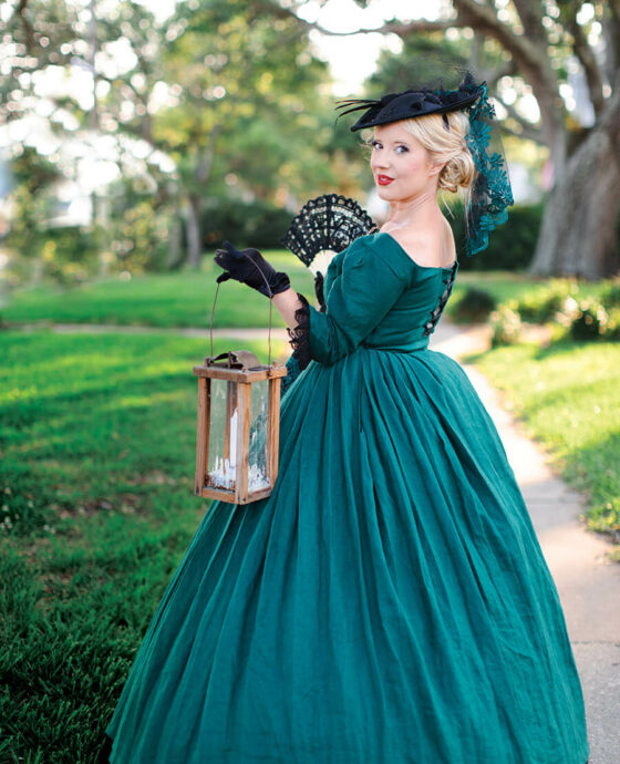 Wearing a teal 1850s day dress and a black riding bonnet, Katie Compton-Boyd stands in front of the Northrop Mall antiques store on East Moore Street in Southport. Holding a candle-lit lantern and a black lace hand fan, she tells the rapt audience that surrounds her the ghost story of whiskey-drinking, cigar-smoking Samuel Northrop.