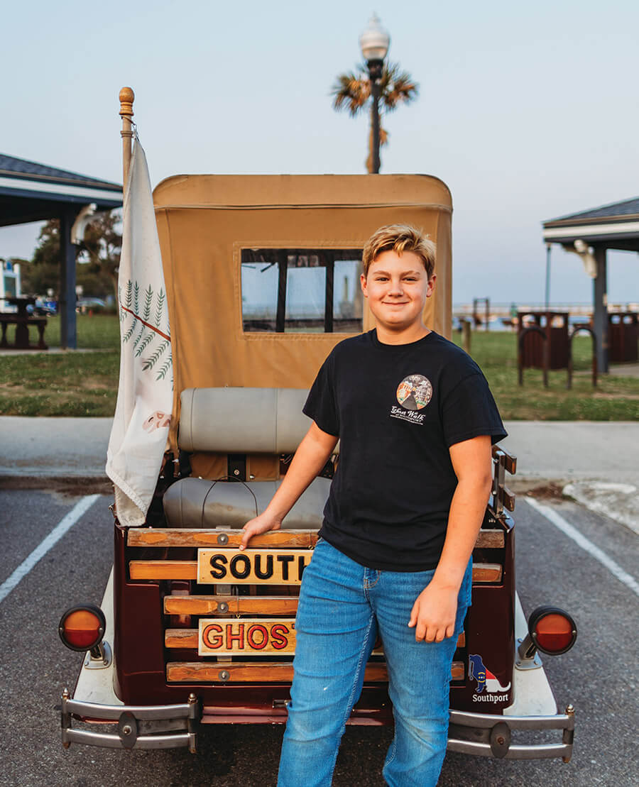 Compton-Boyd’s son, William, often assists his mom during ghost tours, which are advertised on the official company vehicle: a golf cart designed to look like a Ford Roadster. photograph by MALLORY CASH