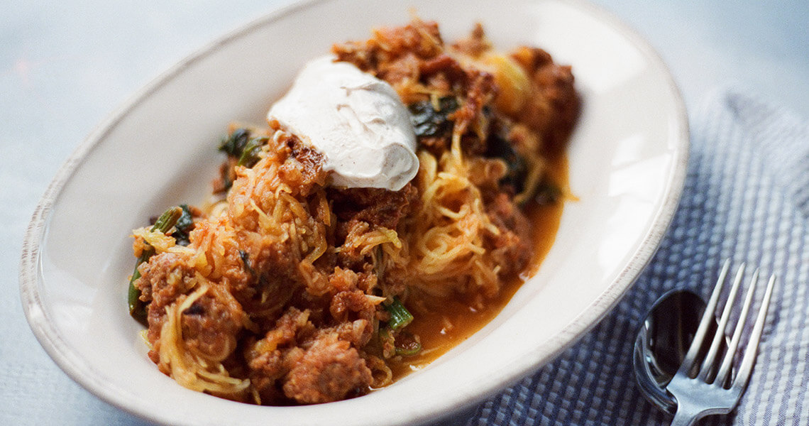 Serve spaghetti squash warm with a dollop of crème fraîche.