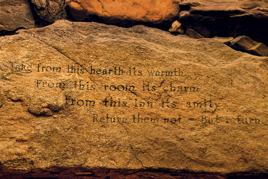 I did neither, instead occupying myself with those quotations. Like the one on the enormous rock that functions as the mantel of the south fireplace. It reads, “Take from this hearth its warmth/From this room its charm/From this Inn its amity/Return them not — but return.”