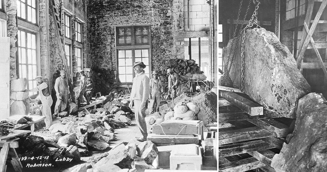 Stonemasons, some of whom also worked on the Biltmore House, used chains and pulleys to move boulders into the Great Hall in 1913. Photography courtesy of GROVE PARK INN COLLECTION, D. H. RAMSEY LIBRARY, SPECIAL COLLECTIONS, UNIVERSITY OF NORTH CAROLINA AT ASHEVILLE 28804