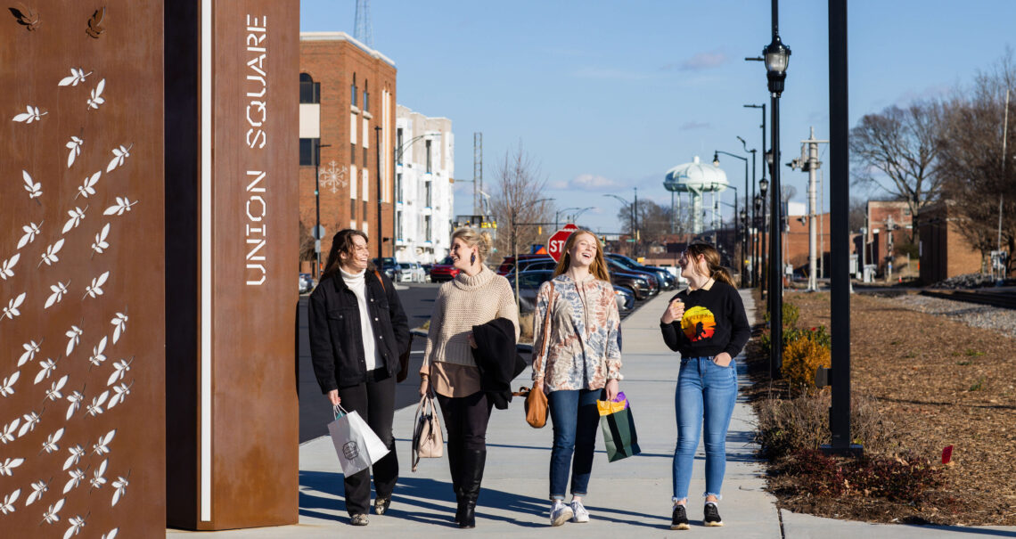 When you return to City Walk, cross the brand-new pedestrian bridge spanning Highway 127 under a pair of towering intertwining arches crafted from Douglas fir. Before you know it, you’re at Union Square, in the heart of Hickory.