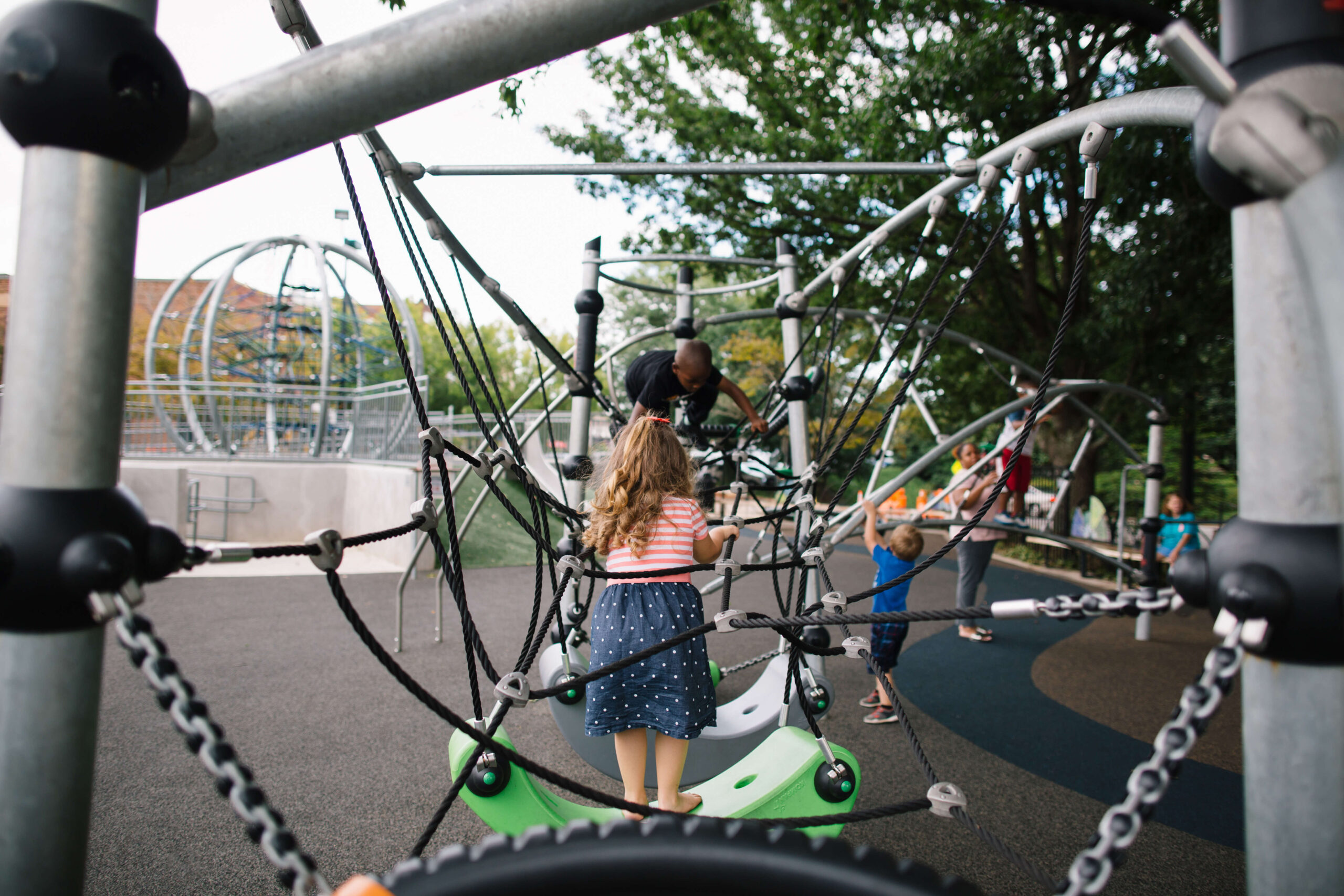 A multi-level sphere webbed with sturdy ropes beckons little climbers at Lowes Foods City Park. photograph by Visit Hickory