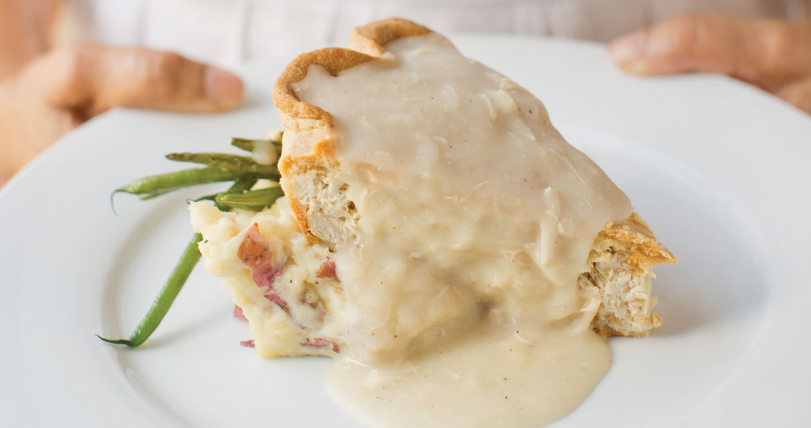So his other addition was gravy, and lots of it. Besides using it in the pie’s filling, gravy tops each slice and is drizzled over a bed of red-skinned mashed potatoes and green beans.