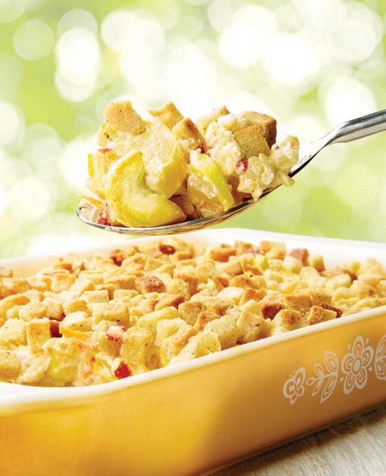 Spread half of cornbread mixture in baking dish. Add squash mixture and spread evenly to all corners. Top with remaining cornbread mixture.