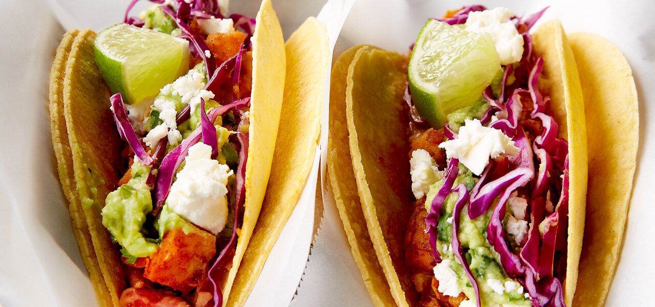 To assemble, spread beans down the center of each tortilla, then top with sweet potatoes and avocado dip. Garnish with Feta, cabbage, and lime wedges.