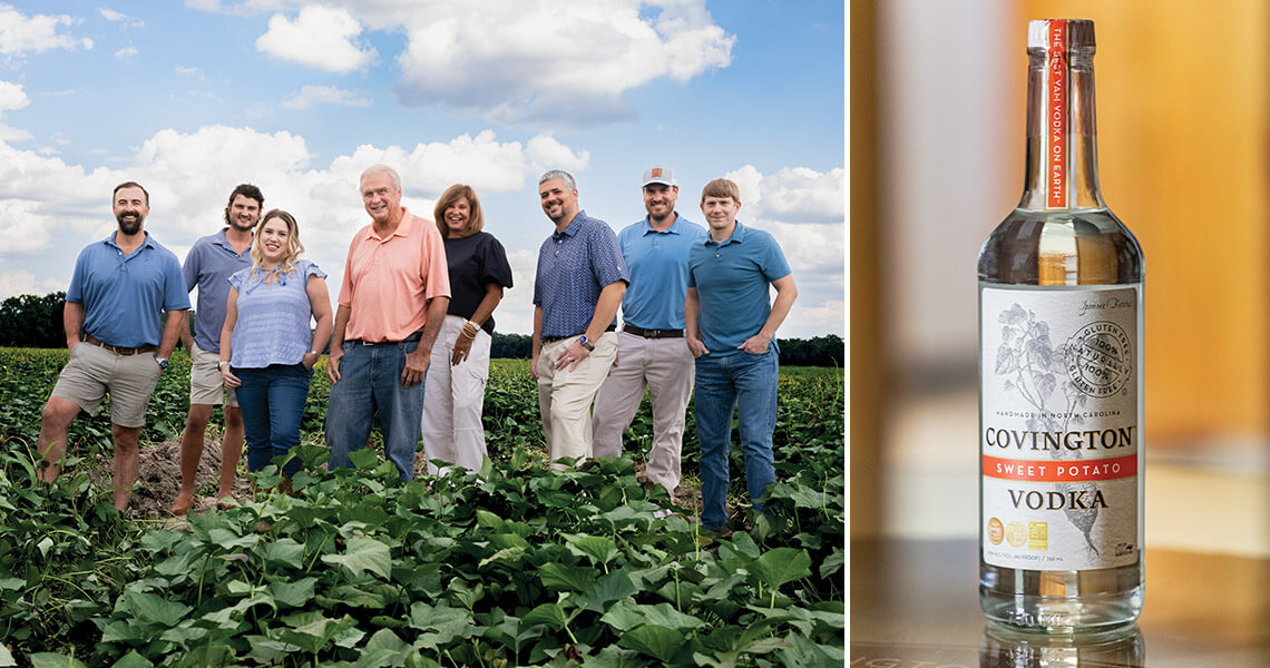 Covington Vodka, made from sweet potato puree, is one of many products developed by the Ham Farms team: (from left) Will Martin, Brandon Garris, Sydnee Ham, Bobby Ham, Amy Ham, Adam Ham, Trey Wilson, and Justin Bagley. photograph by Charles Harris