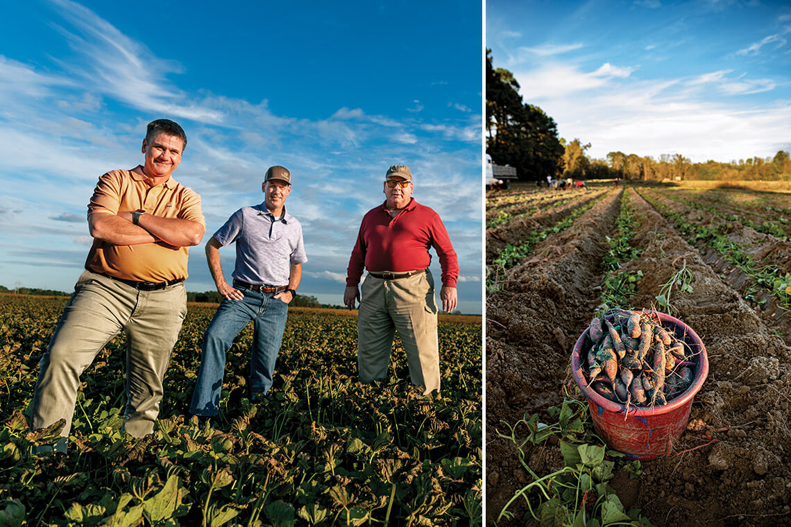 From left: Dewey Scott, Linwood Scott III, and Linwood “Sonny” Scott Jr. grow sweet potatoes on a family farm that dates to the late 1800s. photograph by Charles Harris