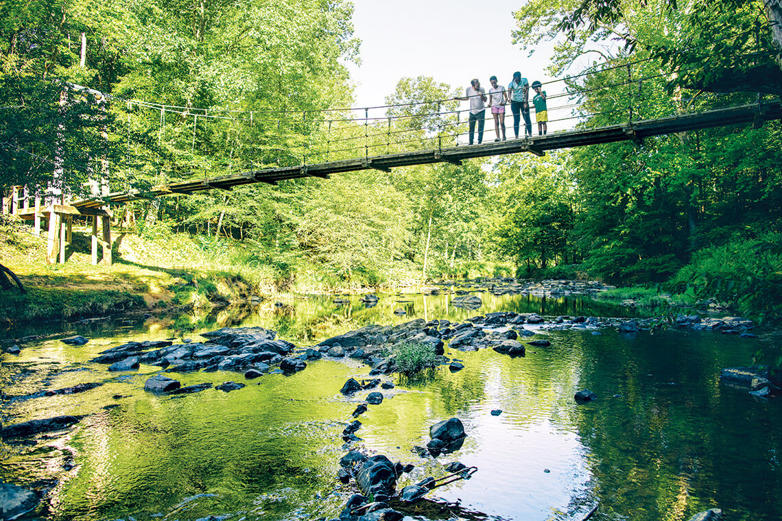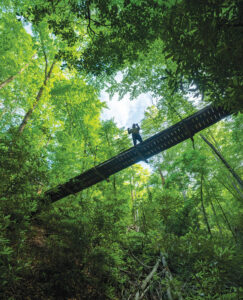 A swinging bridge along the Andy Cove Nature Trail blends seamlessly with the towering hardwoods and lush mountain laurels and rhododendrons of Pisgah National Forest. photograph by Derek Diluzio