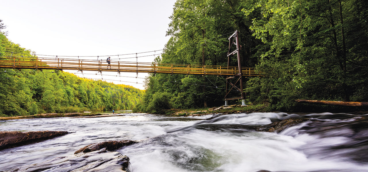 Not all of North Carolina’s swinging bridges are located in the western part of the state. In the Triangle area, visitors to Eno River State Park encounter a suspension bridge that gently bounces with every step. photograph by Tyler Northrup