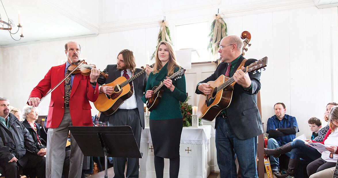 Bluegrass musicians love the simple beauty of Old St. Paul’s Lutheran Church in Newton. On Christmas Eve, the 200-year-old wooden chapel fills with the sweet sounds of strings and the joy of the season.