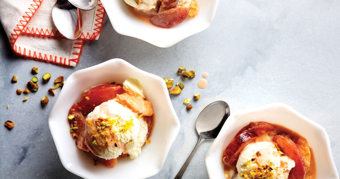 Simmer red plums and orange slices with cream and sugar to create this elegant dessert.
