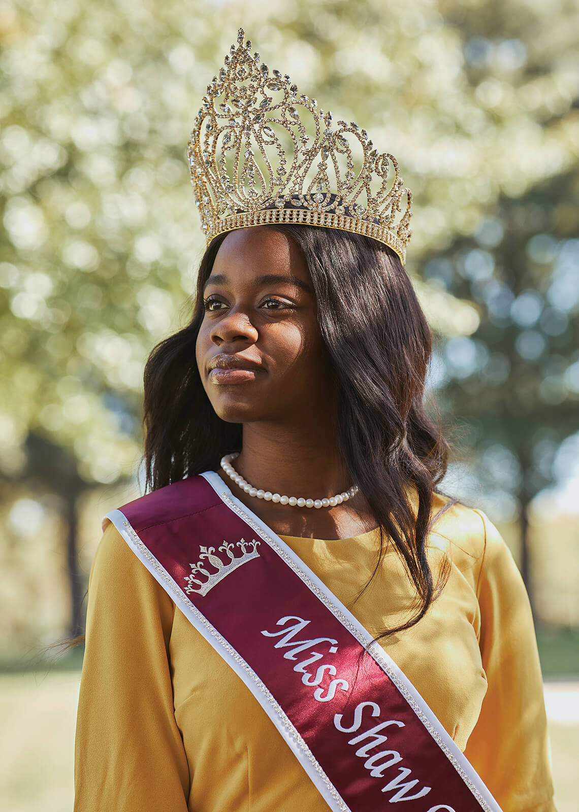 Current Shaw student Biancé Wilburn wears her Miss Shaw regalia with pride. photograph by Alex Boerner