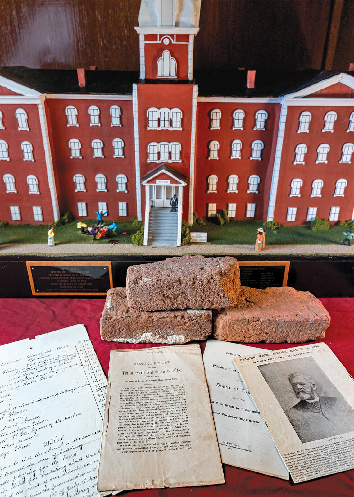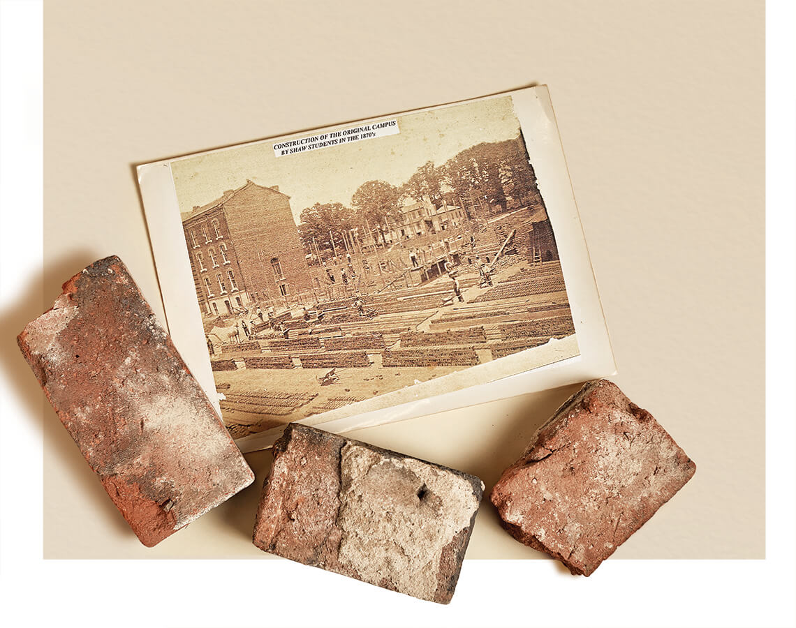 Among the Shaw University archives are bricks used to construct early buildings like Shaw Hall. The bricks were made by original students whose classes were held in old sharecroppers’ cabins. photograph by Alex Boerner