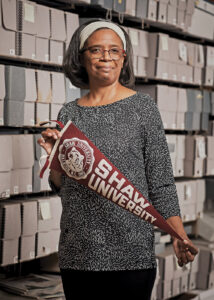 Library Specialist Velma Williams shows off a vintage Shaw pennant. photograph by Alex Boerner