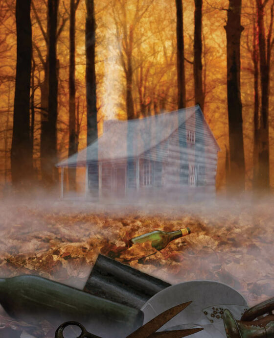When the toilet’s shape becomes bulbously evident, I laugh out loud. It seems so out of place on this knoll in the big woods, far from the nearest house or road. But I know a good find when I see one. Nearby is a chunk of tin roofing peeking out from the leaves, and a rusty motor of some sort or another, and a trove of old glass bottles. The ground is mounded up and uneven. I’m thinking I’ve hit the mother lode.