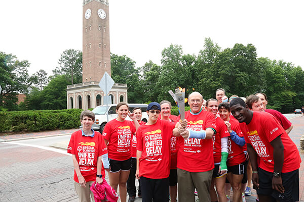 Taft leads a team through campus as part of a torch relay for the Special Olympics. Photograph courtesy of Max Englund, UNC Health Care
