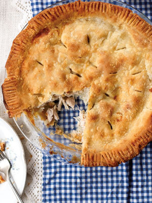 Place one pastry round in a 9-inch pie pan. Put chicken into pan, and pour broth over pieces to almost cover. Include floating fat.