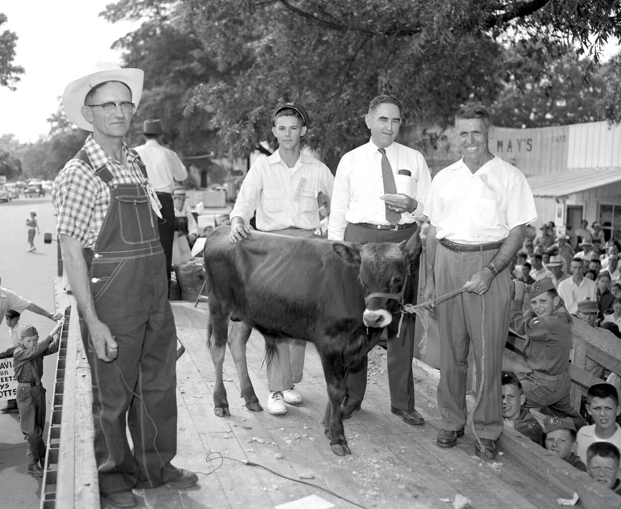 In 1954, while running for U.S. Senate, Scott (second from right) described walking 21 miles in six hours and promised a bull calf to anyone who could beat his time. Forty walkers participated in a footrace; 36 — including the winner, Paul “Hardrock” Simpson (right) — took home a calf. photograph by The News & Observer collection, courtesy of the state archives of north carolina