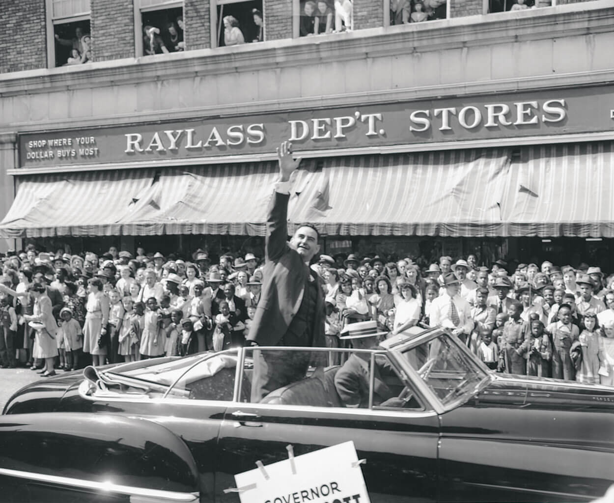 After winning the governorship with his “Go-Forward” campaign, Scott participated in the Forsyth County Centennial Celebration in May 1949 — a grand event that included a pageant and a parade that rolled down West Fourth Street in Winston-Salem. photograph by FORSYTH COUNTY PUBLIC LIBRARY PHOTOGRAPH COLLECTION; PIN IMAGE COURTESY OF THE NORTH CAROLINA MUSEUM OF HISTORY