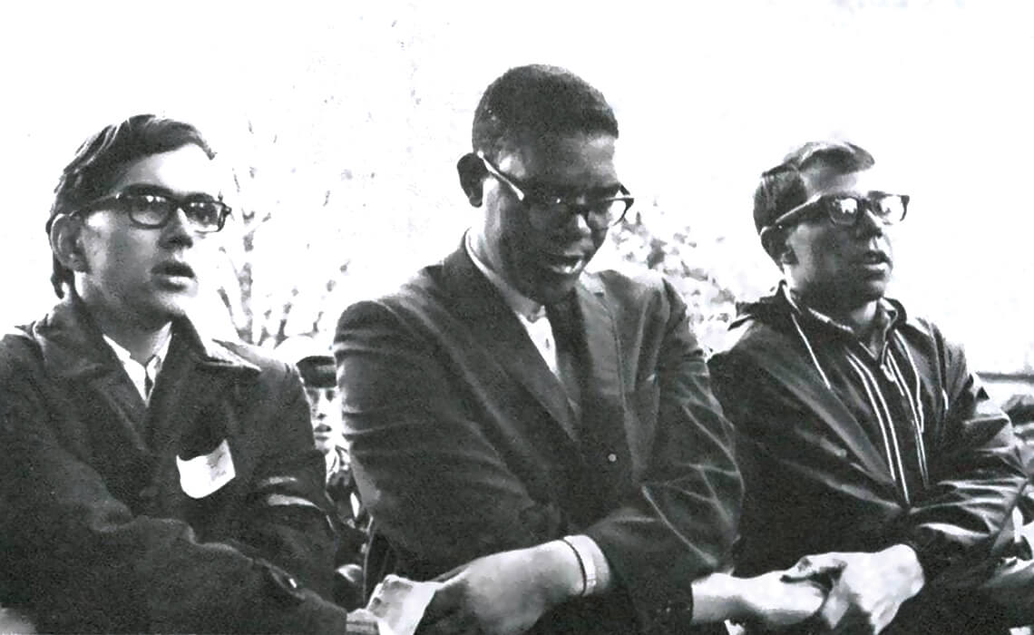 Dr. Samuel DuBois Cook (center), a close friend of King’s and the only African-American professor at Duke at the time, addressed the crowd on April 10. “This is magnificent,” he told them. “You are making profound history.” photograph by Duke University Archives