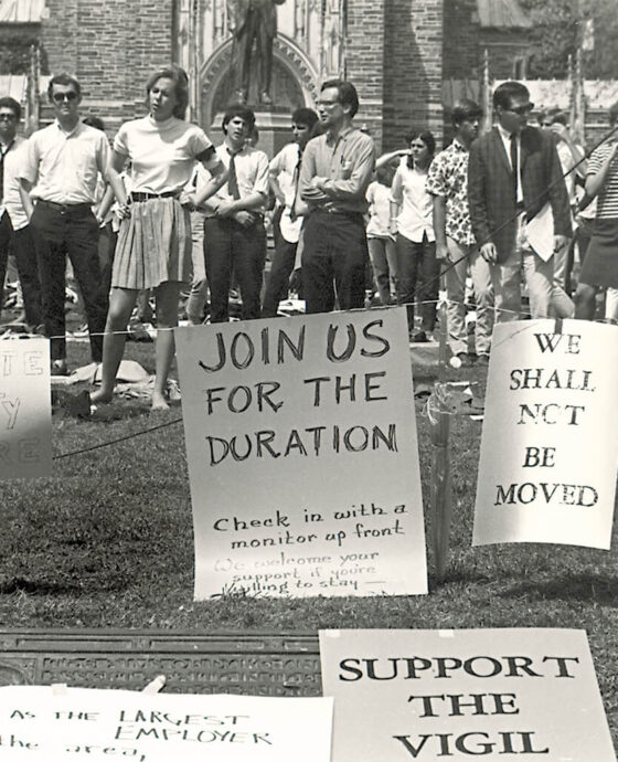 The students shift their demonstration Sunday night to the main quad in front of the chapel. More than 500 join, sitting quietly on the lawn in eight rows. On rope lines and on the ground, they post signs that read “We Shall Not Be Moved,” “Support the Vigil,” and “Join Us for the Duration.” They do not sunbathe or play around. The leaders, aided by volunteers wearing armbands, enforce strict discipline: No violence — and no talking except during specified breaks. It is a time of reverence for King and of serious, concerted action for social justice. Thus is born the Silent Vigil.