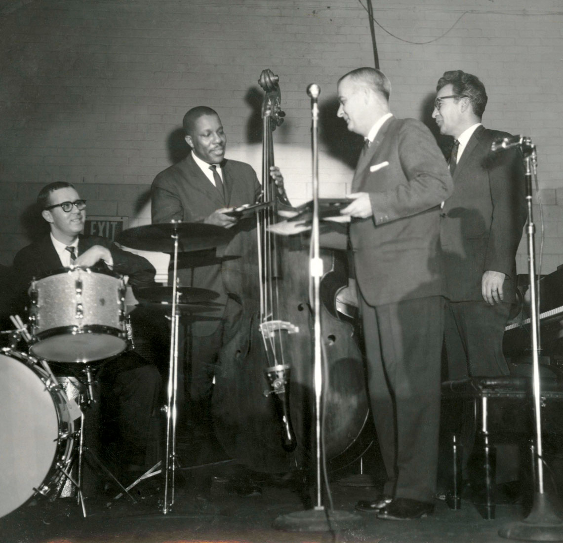 In 1963, the Dave Brubeck Quartet returned to campus, where Dr. Leo W. Jenkins recognized bassist Eugene Wright. photograph by Black and White Images Collections, UA55-01-58331