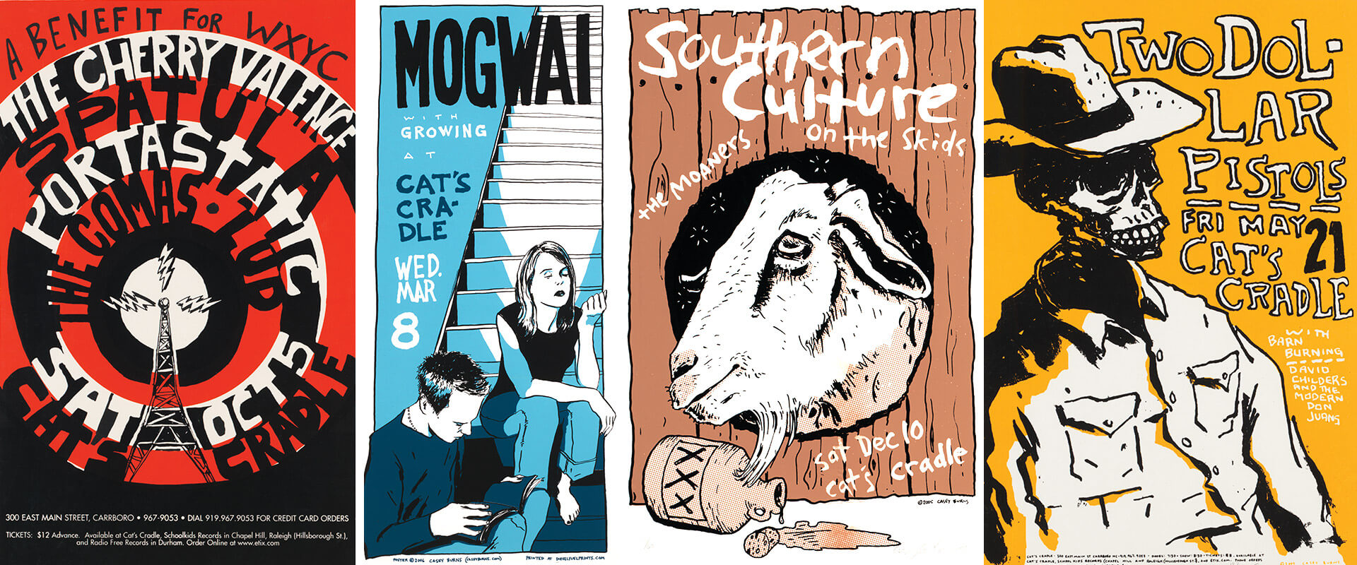 Various Cat’s Cradle show posters by Casey Burns. illustration by CASEY BURNS, FROM THE CASEY BURNS COLLECTION (20415), SOUTHERN FOLKLIFE COLLECTION, WILSON LIBRARY, UNC-CHAPEL HILL