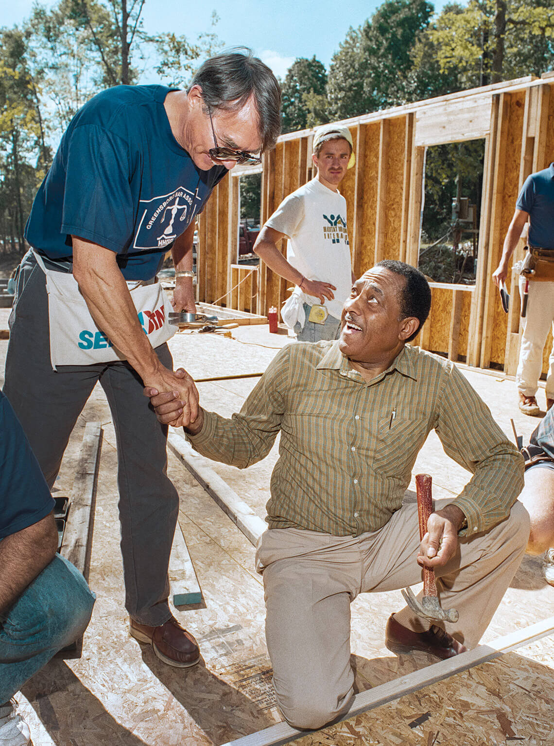 In 1991, Frye and Jim Exum (left), then the chief justice of the state Supreme Court, worked on a Habitat for Humanity home in Greensboro. photograph by Jerry Wolford