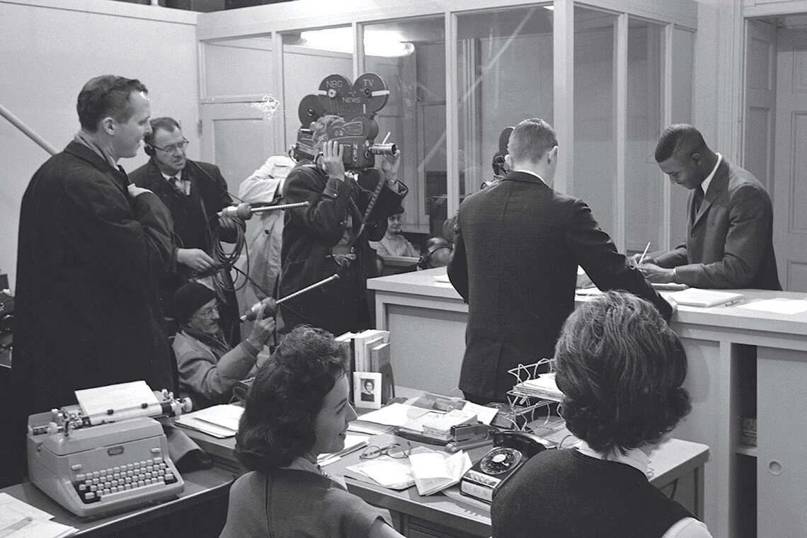 On January 28, 1963, news crews looked on as Gantt filled out paperwork to become the first Black student to attend Clemson University. photograph by CHARLES MOORE/GETTY IMAGES