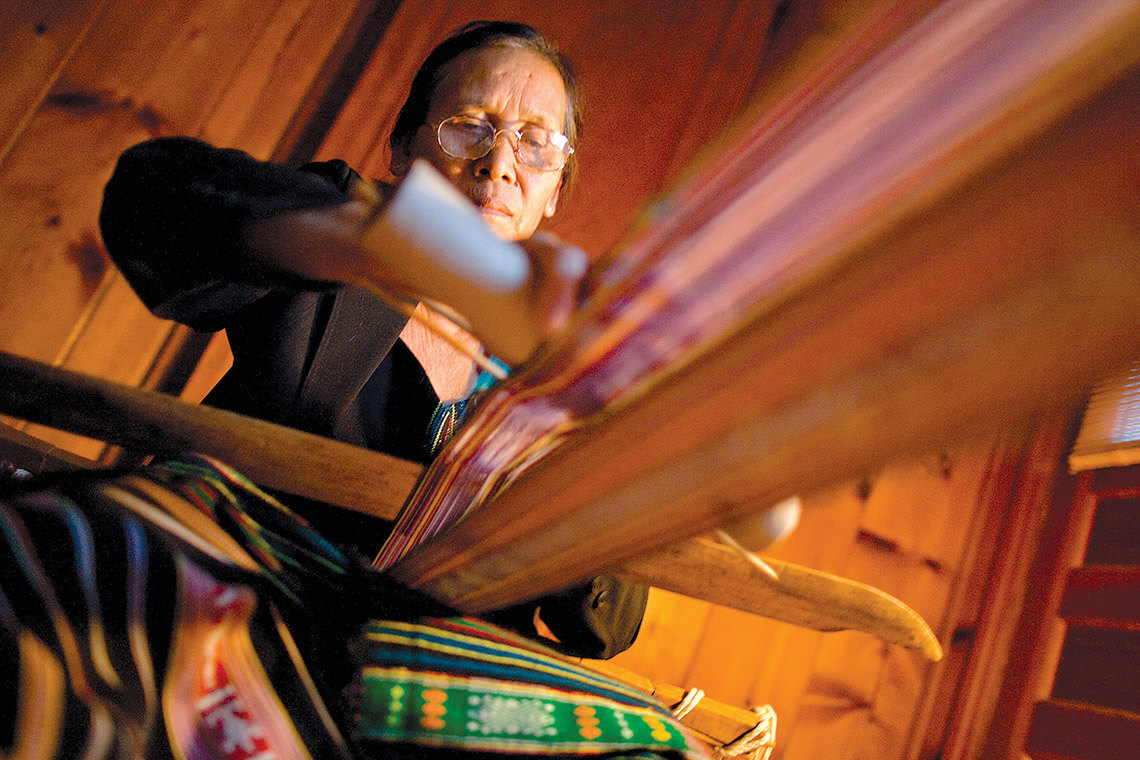 Before she died in 2021, H Ju Nie’s talent for backstrap weaving helped keep the Montagnard tradition alive. On a loom built by her husband, Nie designed intricate blankets, clothing, baby carriers, and bags — each a work of art. photograph by Jerry Wolford