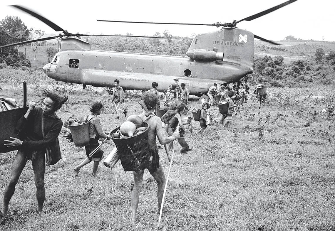 In September 1968, U.S. Army helicopters transported members of the Montagnard nation to a refugee camp during the Vietnam War. Many Montagnards later settled in North Carolina. photograph by ASSOCIATED PRESS/HENRI HUET