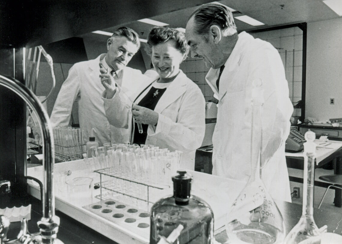Although they won the Nobel Prize for their overall methodology, Elion and Hitchings, pictured with Stan Bushby (left) at RTP in 1972, also discovered specific drugs that saved or improved people’s lives. Photography courtesy of GSK HERITAGE