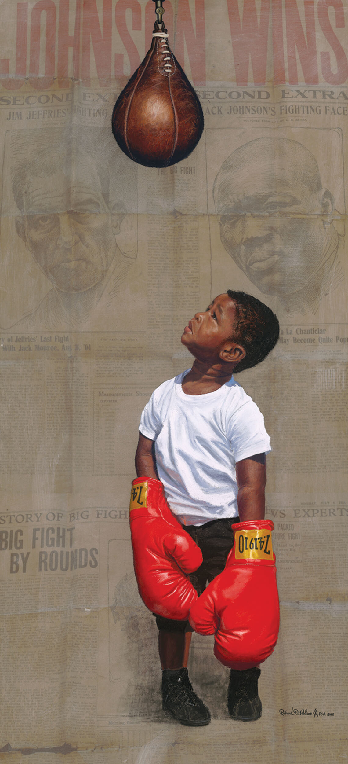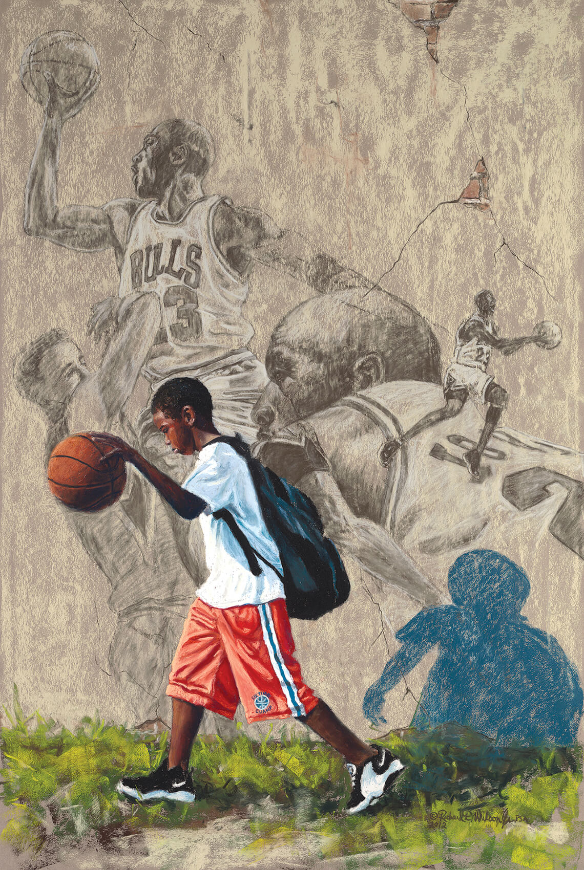 Like the kids depicted in Jack Johnson (above) and In His Shadow (Michael Jordan) — two works in Wilson’s “Shadow Series” — the artist dreamed of making an impression on the world. Today, Wilson has achieved that dream with his art. painting by Richard Wilson