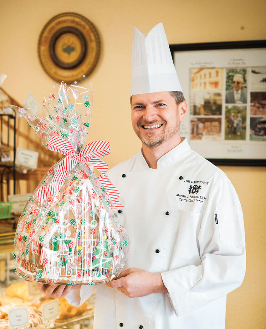 Martin Brunner and his staff create holiday gift baskets and gingerbread houses that can be customized to look like real-life homes. photograph by Faith Teasley
