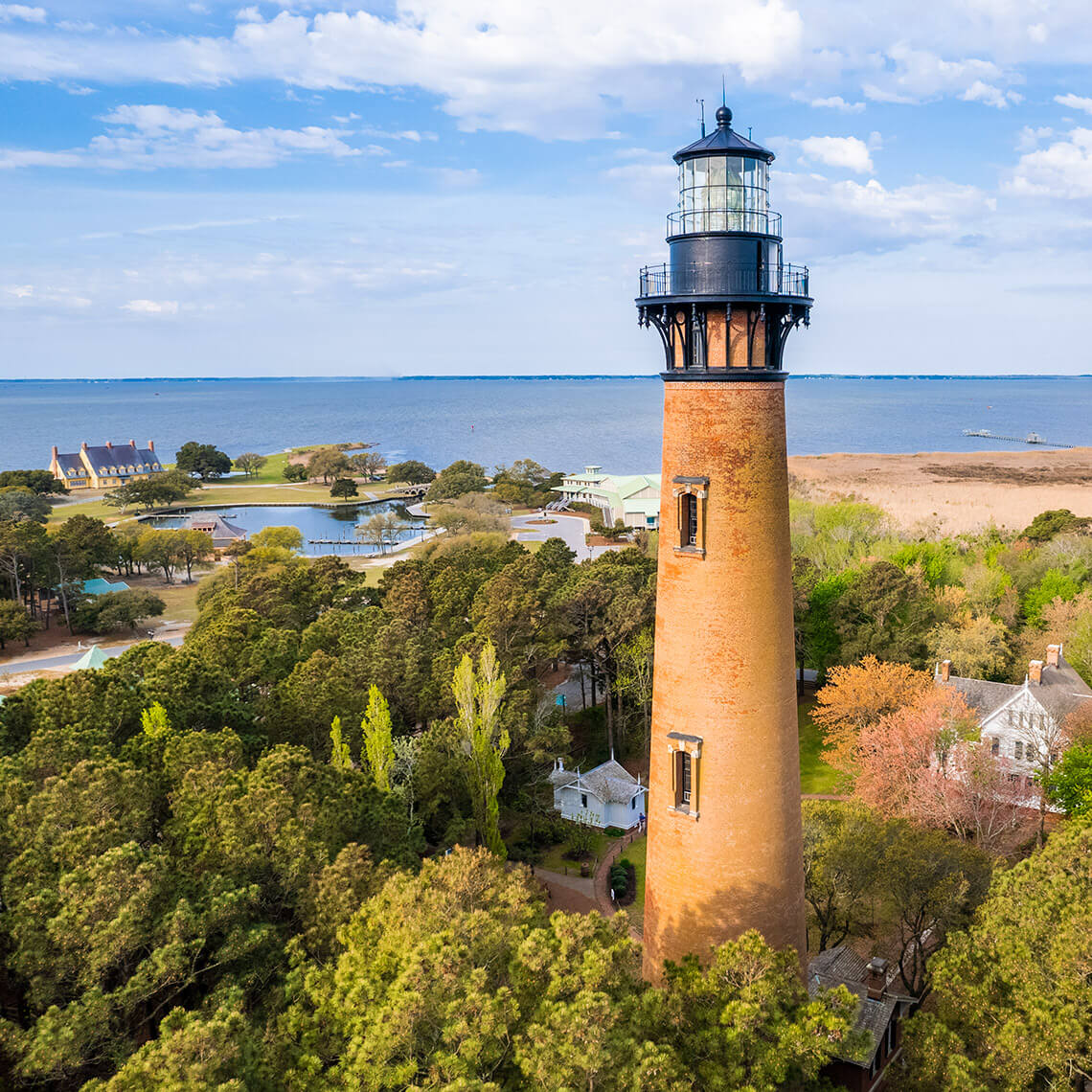 First lit in December 1875, our northernmost lighthouse is one of only a few in the country that still uses its original Fresnel lens. Those who climb the 220 steps to the top are rewarded with views of Currituck Sound, the Atlantic Ocean, and the village below, tucked among the trees.