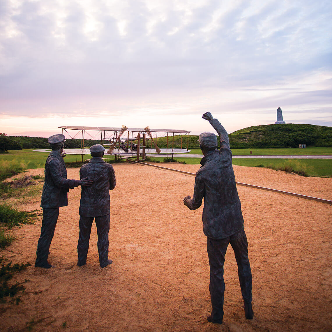 Self-taught engineers Orville and Wilbur Wright forever changed the skies with their first successful flights in Kitty Hawk in 1903. At their memorial park, trace their flight path, see a reconstruction of the camp where they lived, learn about their flight experiments through interactive exhibits, and examine a “please touch” sculpture of the Wright Flyer.